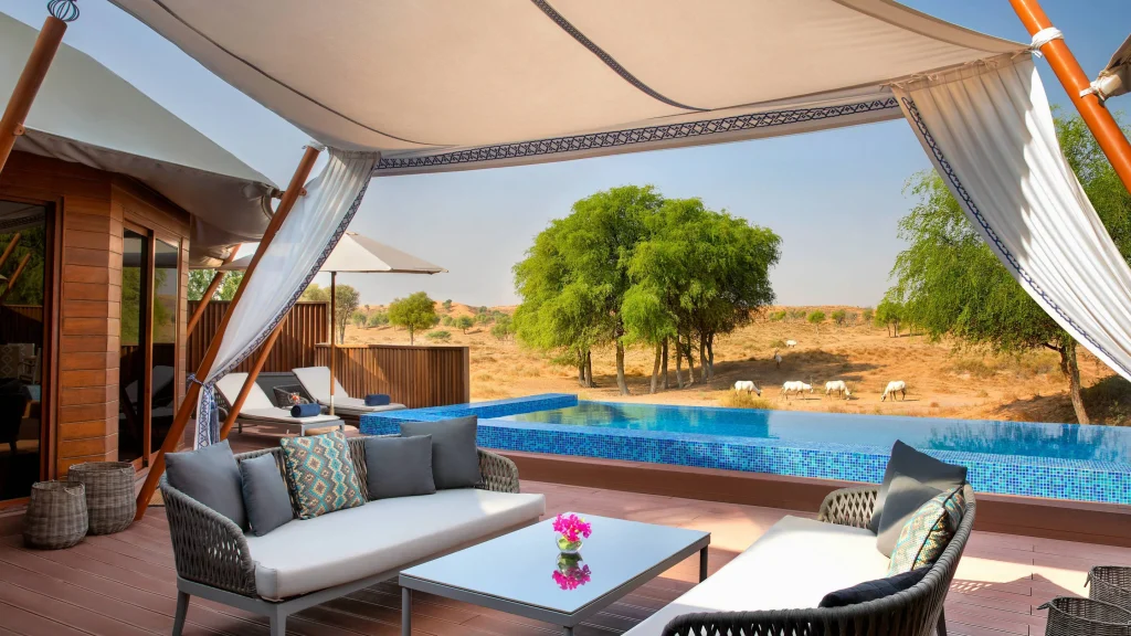 Al Maha Desert Resort & Spa offers a secluded escape surrounded by sweeping dunes and wildlife. Its private villas, each with a pool, create a tranquil setting ideal for rest and rejuvenation. The resort blends luxury with nature, making it one of Dubai’s most iconic desert retreats.