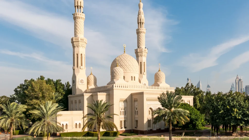 One of Dubai’s most iconic mosques, Jumeirah Mosque is a key cultural landmark, welcoming visitors under the “Open Doors. Open Minds.” initiative. Built entirely from white stone, it features intricate geometric designs, offering a stunning backdrop for photography. Guided tours provide insights into Islamic traditions, concluding with a complimentary authentic Emirati meal for a truly immersive experience.