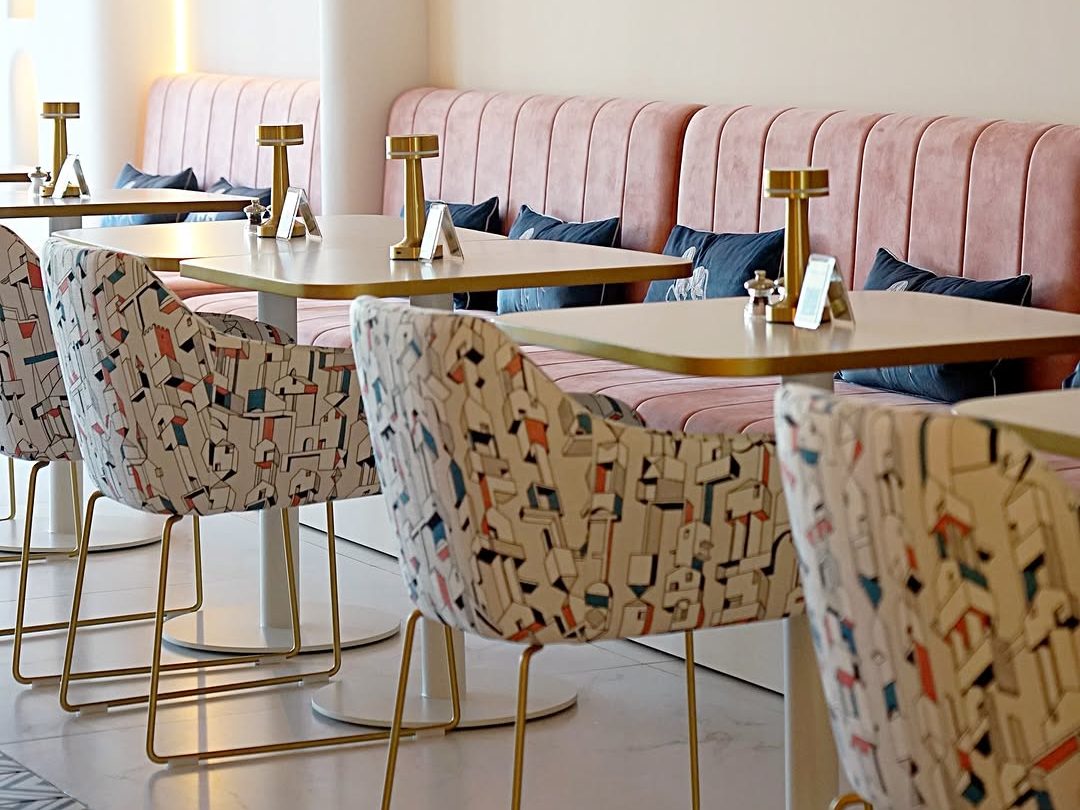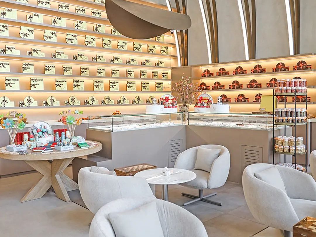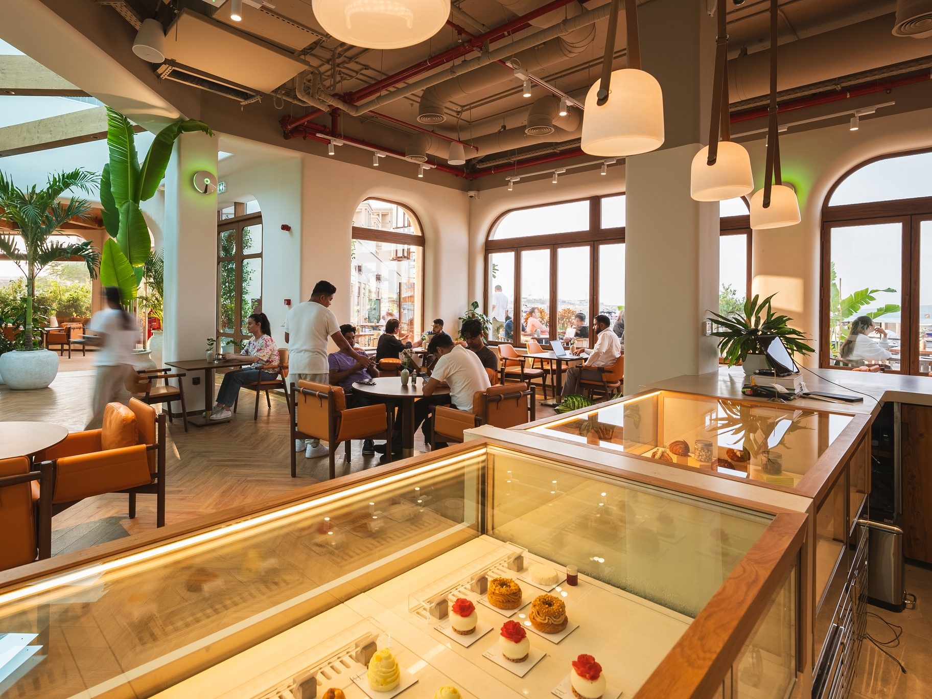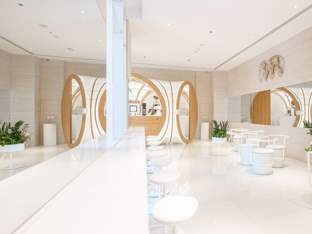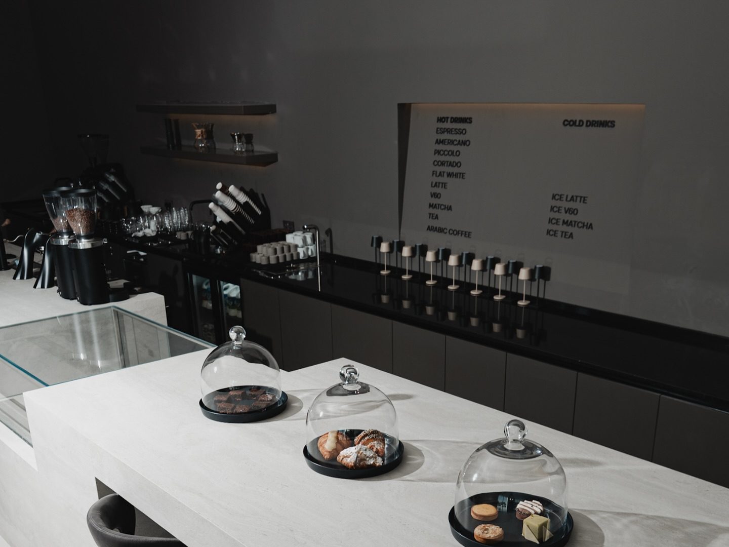 Situated on Fashion Avenue in Dubai Mall, this café features a welcoming open-plan layout centered around a service island, complemented by intimate seating arrangements.