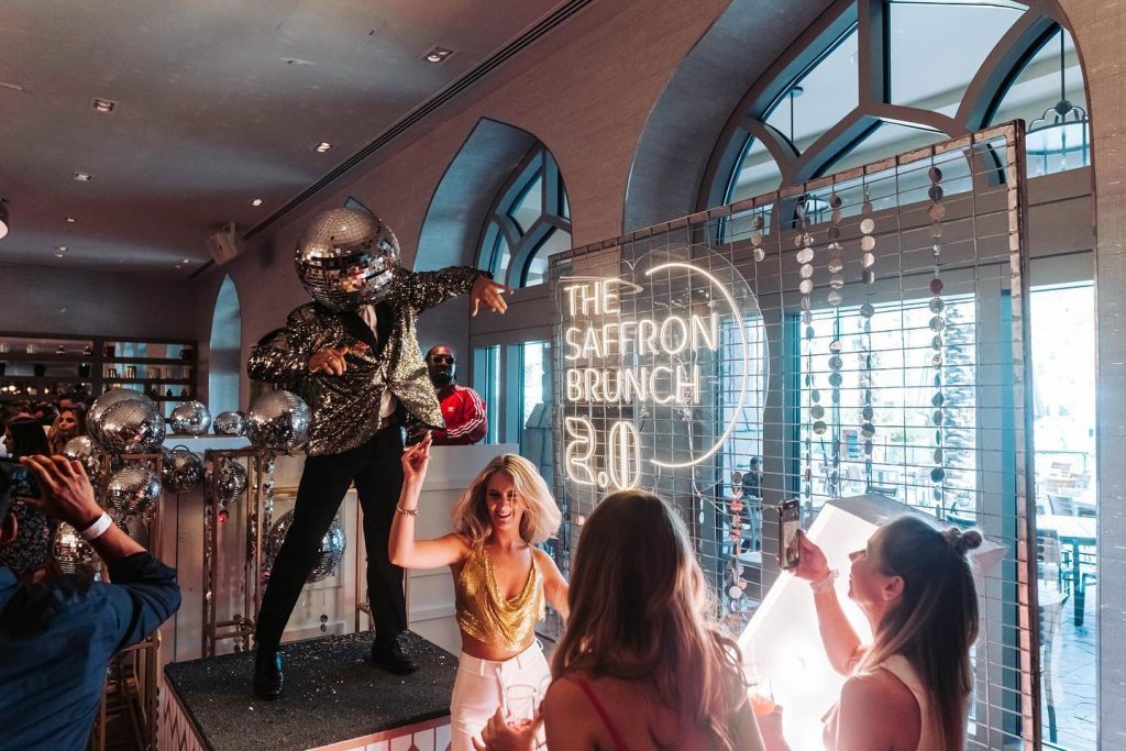 Saffron Brunch at Atlantis The Palm is known for its legendary party vibes, featuring live DJs, dancing, and an extensive buffet. The menu includes everything from Asian delicacies to premium seafood, complemented by an endless selection of drinks. With its upbeat energy and interactive entertainment, Saffron is one of Dubai’s most iconic party brunches.