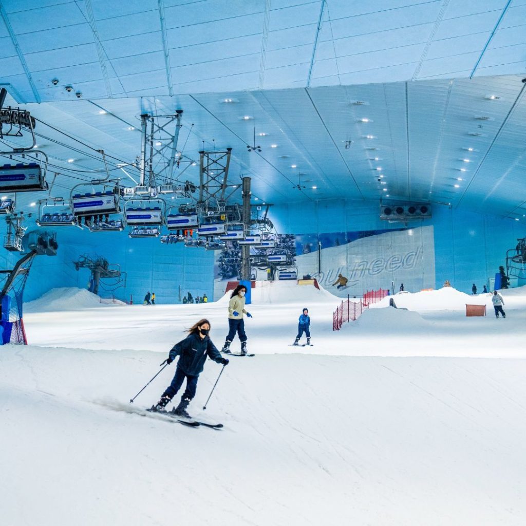 Located within the Mall of the Emirates, Ski Dubai is an indoor ski resort featuring 22,500 square meters of indoor ski area. It includes five slopes of varying difficulty, a freestyle area, and a snow park. Despite Dubai’s desert climate, Ski Dubai maintains a temperature of -1 to 2 degrees Celsius year-round.