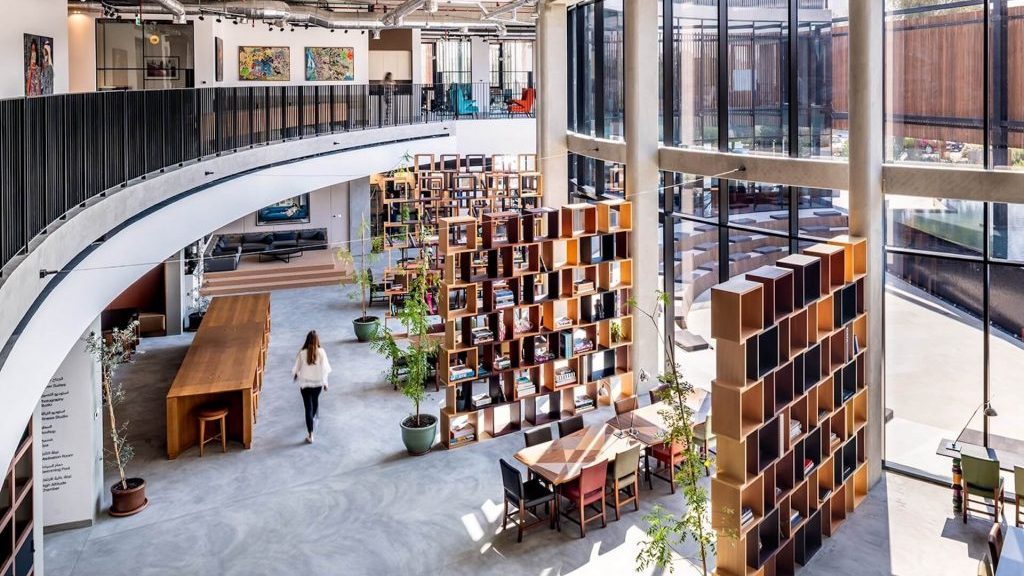The reading room at Jameel Arts Centre doubles as a peaceful co-working environment surrounded by art and literature. It offers quiet desks, Wi-Fi, and calming views of Jaddaf Waterfront. Ideal for solo workers who prefer a cultural setting.
