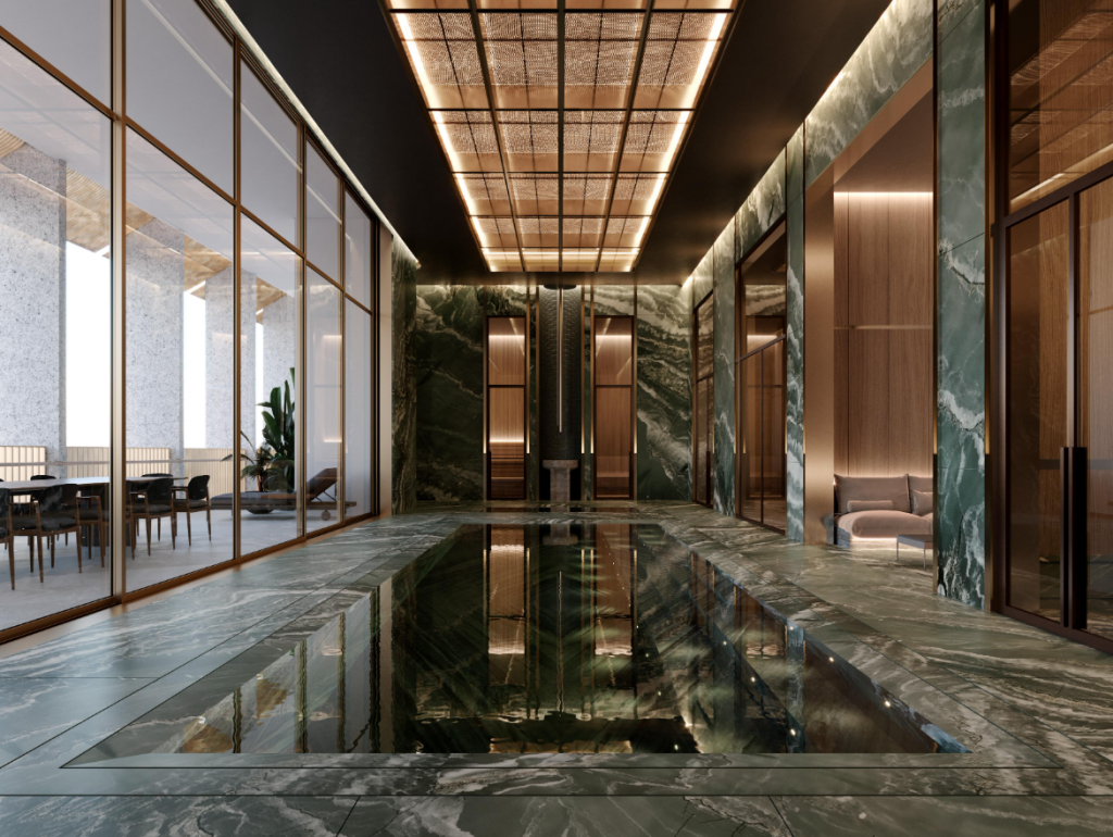 The interiors have been crafted by designer Tristan Auer, known for work on iconic properties like Carlton Cannes and Hôtel de Crillon. His approach blends muted grandeur with veined marble, bronze accents, and hand-finished woods. A six-bedroom duplex penthouse will crown the development, featuring a private wellness floor with a marble pool, spa, and gym—alongside access to exclusive amenities including an infinity pool, shaded daybeds, a modern fitness studio, a greenery-framed pool bar, and a private dining room.