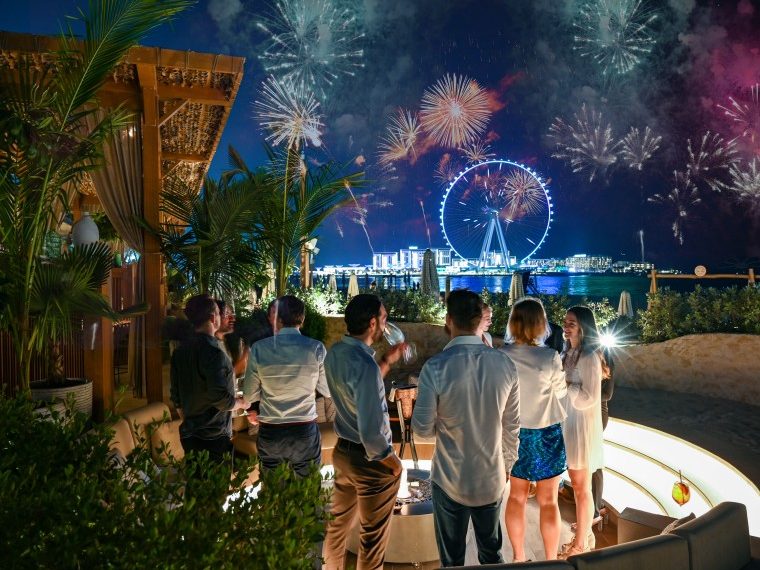 Verde Beach at Jumeirah Beach Hotel offers an upscale yet laid-back setting for watching the fireworks this New Year’s Eve. With stunning views of Burj Al Arab and the Dubai skyline, it’s an exceptional beachside spot to ring in the new year. Guests can unwind in a relaxed atmosphere while enjoying gourmet food and refreshing cocktails.