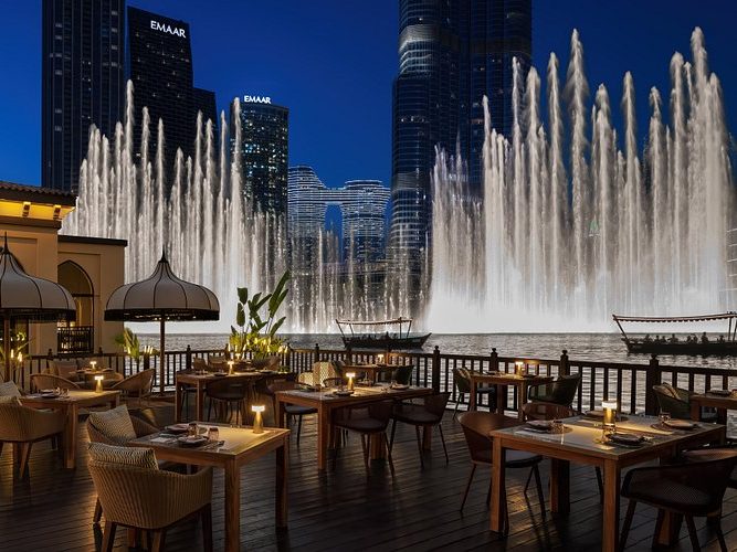 Thiptara at Palace Downtown offers a stunning waterfront dining experience with views of the Burj Khalifa, perfect for enjoying the New Year’s Eve fireworks. Known for its delectable Thai cuisine and romantic setting, it’s an ideal venue to celebrate with loved ones. Guests can enjoy the vibrant atmosphere while watching the fireworks light up the sky over Dubai Fountain.