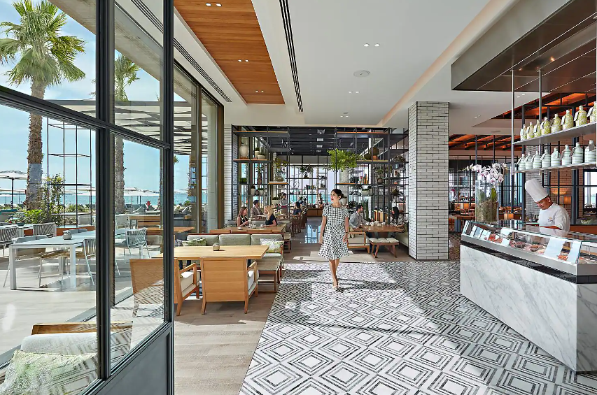 The glass-walled brasserie, The Bay, has indoor and outdoor seating and overlooks the sea and adjacent pool. The Bay is a casual dining spot that serves up Mediterranean-influenced dishes. Breakfast features a wide range of stations including a healthy corner, an egg area as well as gluten-free and paleo options for those with special dietary requirements. Be sure to give their excellent coffee a try. Breakfast is served between 6:30 and 11 am.